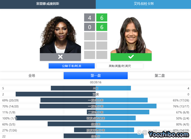 第二盘比赛,小威廉姆斯率先发球。小威的一发状态不佳,二发力量不足,拉杜卡努连续在第一局、第三局实现破发,比分3-0领先。小威的体能下降明显,发球和进攻都打得十分的勉强,拉杜卡努打得毫不手软,发球大角度调动,进攻大角度,连赢6局,轰出了6-0,轻松拿下第二盘,大比分2-0获胜,晋级第二轮。