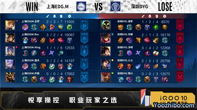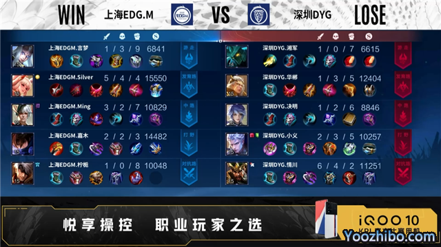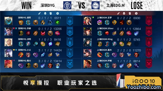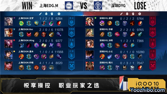 开局双方正常抢线。2分40秒野区深圳DYG击杀孙尚香,拿下一血,打出0换2。3分20秒上海EDG.M拿下暴君。3分56秒中路深圳DYG击杀娜可露露,打出0换2,摧毁敌方发育路外塔。5分07秒深圳DYG拿下主宰,摧毁敌方对抗路外塔。7分36秒深圳DYG拿下暴君。8分34秒深圳DYG摧毁敌方对抗路二塔中路外塔,9分31秒拿下主宰。10分27秒深圳DYG拿下暗影主宰、暗影暴君。11分45秒深圳DYG摧毁敌方发育路二塔、中路二塔,12分24秒摧毁敌方中路高地,14分13秒拿下暗影主宰。15分13秒深圳DYG摧毁敌方对抗路高地、发育路高地,拿下暗影暴君。16分20秒高地上海EDG.M击杀盾山,深圳DYG花木兰二连击破,打出3换3,摧毁水晶拿下比赛。