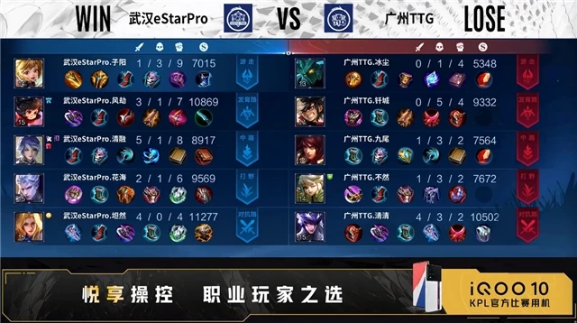 开局武汉eStar入侵野区击杀澜拿到一血。1分53秒双方发育路1换1。3分19秒广州TTG野区击杀宫本武藏。5分13秒武汉eStar拿下暴君。5分24秒武汉eStar野区击杀沈梦溪。7分16秒武汉eStar拿下主宰。9分15秒武汉eStar摧毁敌方中路外塔。9分35秒广州TTG抢到暴君。10分43秒武汉eStar中路击杀大乔。13分07秒广州TTG野区打出0换2。14分11秒武汉eStar发育路打出0换3。14分24秒武汉eStar摧毁敌方中路高地塔。14分38秒武汉eStar摧毁敌方水晶拿下比赛。