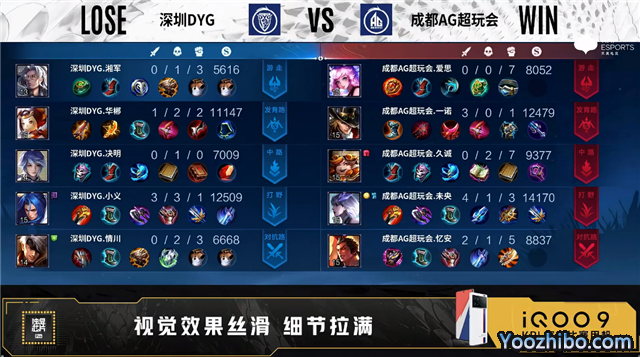 双方常规开局。4分31秒深圳DYG对抗路击杀娜可露露拿到一血。6分09秒成都AG摧毁敌方发育路外塔。7分50秒成都AG摧毁敌方对抗路外塔。7分58秒深圳DYG摧毁敌方发育路外塔。9分09秒深圳DYG野区击杀娜可露露。9分37秒深圳DYG拿下主宰。10分55秒深圳DYG拿下暗影主宰。11分10秒深圳DYG拿下暗影暴君并打出0换3。12分32秒深圳DYG对抗路击杀弈星并摧毁敌方对抗路二塔。13分02秒深圳DYG对抗路击杀鲁班大师。13分34秒深圳DYG摧毁敌方对抗路我高地塔。15分23秒深圳DYG野区击杀夏侯惇。15分36秒深圳DYG野区打出1换2。16分09秒深圳DYG团灭对手摧毁水晶拿下比赛。