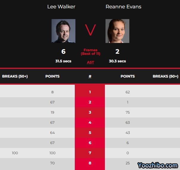 第七局,李沃克轰出了单杆100分、一杆制胜+零封,5-2拿到了赛点。 第八局,埃文斯17分中断,李沃克再上手扩大分差,43-17再次中断。埃文斯打进长台,追到了25分,打丢了红球,在随后又留下了中袋袋口球机会,李沃克打进后、转入防守。埃文斯继续漏机会,李沃克拉开分差,还是顺利拿下,6-2晋级。