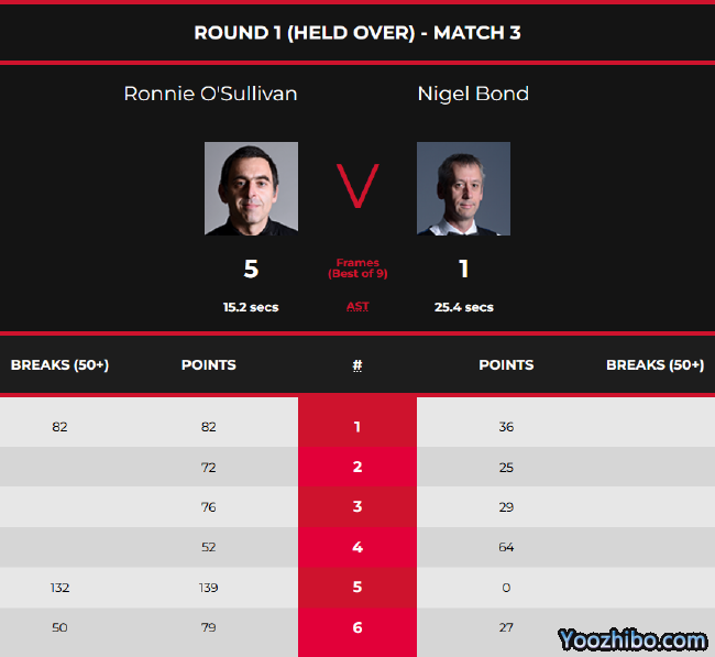 第一局,邦德单杆36分防守;防守比拼,邦德留下机会,奥沙利文上手单杆82分拿下。