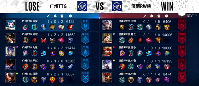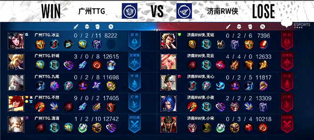 双方和平开局。1分50秒上路团战,兰陵王拿下一血。2分10秒兰陵王拿下主宰,露娜拿下暴君。3分30秒上路团战,梦奇被击杀。4分10秒马超推掉上路一塔。5分钟中路团战,广州TTG打出0换2。5分20秒李元芳推掉中路一塔。6分30秒暴君团,广州TTG打出1换4。7分钟李元芳推掉中路高地塔。8分30秒广州TTG强攻上路高地塔,团战济南RW侠打出1换3。9分30秒露娜拿下主宰。马超被击杀。10分50秒兰陵王拿下暴君。12分30秒兰陵王拿下主宰。14分30秒高地团战,广州TTG打出1换4。14分43秒广州TTG推掉水晶拿下本场比赛胜利。