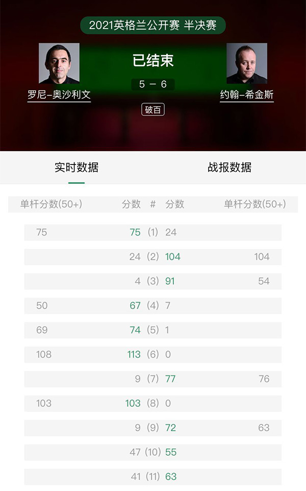 直播车讯北京时间11月7日消息,2021斯诺克英格兰公开赛结束半决赛的争夺。首场半决赛,“火箭”罗尼-奥沙利文,以5-6被巫师”约翰-希金斯逆转。第一局,奥沙利文单杆75分,以75比24拿下。第二局,希金斯单杆104分,以104比24拿下。第三局,希金斯单杆54分,以91比4拿下。第四局,奥沙利文单杆50分,以67比7拿下。双方2-2。第五局,奥沙利文单杆69分,以71比1拿下。第六局,奥沙利文单杆108分,以113比0拿下。奥沙利文4-2建立优势。第七局,希金斯单杆76分,以77比9拿下。第八局,奥沙利文单杆103分拿下。奥沙利文5-3赛点。