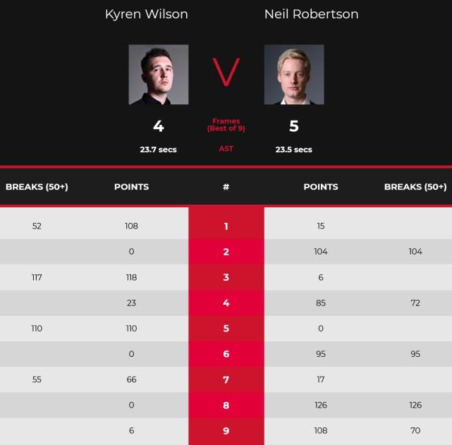 第一局,罗伯逊手感不佳,仅仅拿到15分,威尔逊单杆52分、108-15轻松拿下,第二局,罗伯逊更是单杆104分还以颜色+零封,1-1扳平。第三局,威尔逊再度爆发,轰出单杆117分,轻松再下一城,2-1再次领先。第四局,罗伯逊发力,单杆72分拿下,再次将大比分2-2扳平,进入中场休息。第五局,威尔逊率先上手,威尔逊单杆110一杆制胜,第六局,罗伯逊还以颜色,单杆95分同样是一杆打死,3-3又打平。第七局,威尔逊失误,罗伯逊打到17分也中断,威尔逊再上手超分,罗伯逊直接认输,威尔逊4-3拿到赛点。第八局,罗伯逊火力全开,单杆126分零封,4-4扳平。决胜局,罗伯逊拼进远台,在随后威尔逊又打丢底库红球,罗伯逊扩大优势,逐步赢下本局。