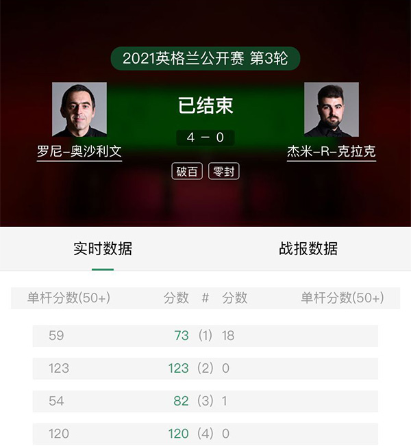 在奥沙利文和克拉克的比赛中,奥沙利文的状态可谓是火力全开。在首局比赛之中,奥沙利文就凭借单杆59分的不错表现以73:18拿下此局比赛的胜利从而以1-0领先克拉克。第二局,奥沙利文成功找到火热手感,单杆直接轰出123分的表现零封对手成功取得2-0的领先。第三局,奥沙利文单杆打出54分的表现从而以82:1拿下此局比赛确定3-0领先克拉克拿到赛点。第四局,奥沙利文本打算打一杆147分满分杆,但是在咨询过裁判有关奖金的事宜后,奥沙利文在打到120分之后随便打了一杆,最终奥沙利文以120:0拿下此局从而以4-0横扫克拉克成功杀进本届赛事的八强。