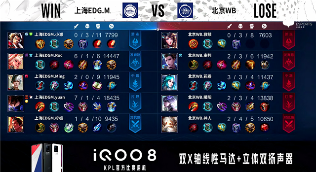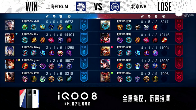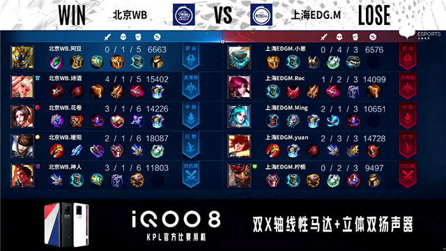 1分27秒,上海EDG.M马可波罗击杀虞姬拿下一血。2分48秒,北京WB控下暴君。3分35秒,双方两处交火,上海EDG.M最终打出1换2。4分05秒,北京WB破掉上海EDG.M上一塔。4分24秒,北京WB中路打出0换2。4分42秒,北京WB控下先知主宰。5分45秒,上海EDG.M击杀东皇太一。6分35秒,北京WB击杀西施。7分09秒,河道团,北京WB打出0换3并控下暴君。8分钟,双方中路1换1。8分52秒,北京WB拿下先知主宰。10分14秒,双方团,上海EDG.M打出0换2。10分42秒,北京WB击杀马可波罗,上海EDG.M控下暗影暴君。12分54秒,野区团,北京WB打出1换2。13分21秒,北京WB击杀西施。14分12秒,北京WB控下暗影主宰。15分04秒,双方团,上海EDG.M打出1换3,橘右京拿下双杀。15分30秒,上海EDG.M破掉北京WB中路两座外塔。15分45秒,上海EDG.M破掉北京WB上高地并击杀云缨。17分18秒,上海EDG.M破掉北京WB下二塔。18分12秒,双方团,上海EDG.M打出1换5,马可波罗拿下四杀,随后摧毁北京WB水晶赢下比赛。