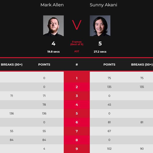 前两局,艾伦基本上没有任何的进攻机会,宋沙瓦手感火热,连续打出了单杆75分和单杆135分,而且两局都是零封了艾伦,先声夺人,宋沙瓦2-0领先。第三局,艾伦找到机会,单杆71分一杆制胜,第四局,宋沙瓦关键球送出失误,艾伦多杆上手78-45再追一局,大比分2-2扳平。休息过后,第五局,艾伦大爆发,轰出单杆136分,3-2反超。第六局,宋沙瓦单杆81分还以颜色,3-3扳平。第七局,艾伦单杆55分中断,宋沙瓦67-55拿下,4-3拿到了赛点。第八局,艾伦顶住压力,单杆84分,将比赛拖入到了决胜局。决胜局,艾伦仅仅拿到4分,宋沙瓦单杆90分轻松赢下,大比分5-4淘汰艾伦。