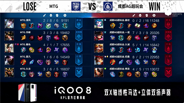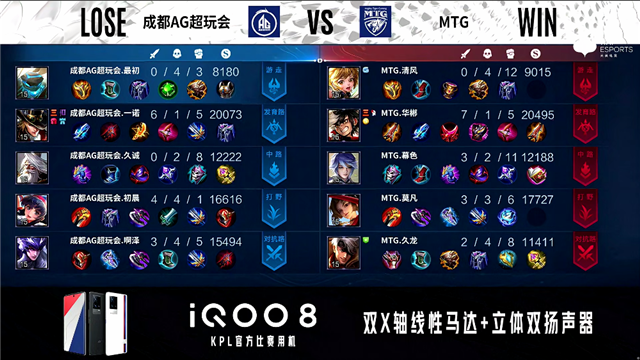 2分31秒,双方团,MTG打出1换2。4分08秒,成都AG澜拿下暴君,随后团战MTG打出1换2。5分16秒,MTG控下先知主宰。5分47秒,成都AG破掉MTG下一塔。5分57秒,上路团战双方1换1。6分45秒,成都AG破掉MTG上一塔。8分56秒,MTG百里守约抢到暴君,随后成都AG击杀吕布。9分30秒,MTG中路击杀狄仁杰。9分50秒,成都AG控下先知主宰,随后MTG击杀澜。10分23秒,MTG控下暗影暴君。12分38秒,MTG控下暗影主宰。13分25秒,成都AG击杀吕布。13分53秒,双方团,MTG打出1换2。14分46秒,MTG控下暗影暴君。16分58秒,MTG控下暗影主宰。17分20秒,成都AG团战打出0换2,澜拿下双杀。17分51秒,成都AG破掉MTG下二塔。19分35秒,MTG控下暗影暴君。19分59秒,双方团战3换3。20分50秒,成都AG击杀不知火舞。21分27秒,成都AG两处团战最终打出0换3。21分57秒,成都AG控下风暴龙王并破掉MTG中高地。22分27秒,成都AG破掉MTG水晶先下一城。