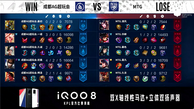 2分16秒,MTG控下暴君,成都AG控下先知主宰。3分36秒,成都AG马可波罗下路击杀孙膑拿下一血。5分14秒,MTG破掉成都AG下一塔。5分35秒,MTG破掉成都AG上一塔。6分09秒,成都AG击杀夏侯惇,随后马可波罗抢到暴君。7分20秒,成都AG破掉MTG下一塔,随后MTG控下先知主宰。10分35秒,MTG中路击杀盾山。10分57秒,暴君团,成都AG打出1换2,但MTG控下暗影暴君。11分30秒,成都AG控下暗影主宰。14分02秒,成都AG破掉MTG下二塔。14分24秒,成都AG击杀云缨。15分14秒,成都AG控下暗影暴君。16分13秒,成都AG控下暗影主宰。17分13秒,双方团战1换1,随后成都AG破掉MTG下高地。18分35秒,双方团,MTG打出1换2。18分57秒,双方团,MTG最终打出1换2。20分22秒,成都AG娜可露露抢到风暴龙王,随后团战成都AG打出3换5,马可波罗拿下三杀。21分15秒,成都AG破掉MTG中高地。24分10秒,MTG上高地反打打出0换4,蒙犽拿下三杀。24分40秒,MTG击杀敌方最后一人马可波罗,中路一波摧毁成都AG水晶扳回一城。