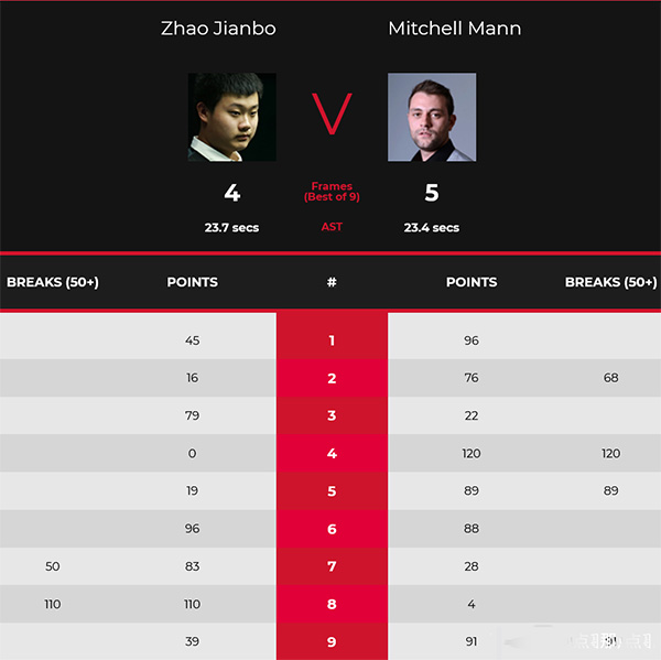 第六局,赵剑波以96-88挽救第一个赛点,比分追成2-4。第七局,赵剑波打出单杆50分,83-28挽救第二个赛点,比分来到3-4。第八局,赵剑波更是轰出单杆110分,110-4挽救第三个赛点,4-4扳平比分,双方回到同一起跑线。决胜局,赵剑波没能上演大逆转的奇迹,米切尔曼打出单杆91分,91-39拒绝逆转,总比分5-4获胜晋级,赵剑波则是功亏一篑非常可惜!