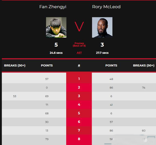 第一局,范争一与麦克劳德开局打得非常胶着,拉锯战中,范争一以57-48先胜一局,1-0取得开门红。第二局,麦克劳德打出单杆74分,86-0零封范争一,1-1追平比分。第三局,范争一单杆53分制胜,69-6再胜一局,2-1领先。第四局,范争一以71-41再胜一局,3-1扩大领先优势。 第五局,局间休息回来之后,范争一以68-6胜出,比分优势扩大到4-1,轻松赢得三个赛点。第六局,没有退路的麦克劳德顽强反击,57-30挽救第一个赛点,比分来到2-4。第七局麦克劳德单杆60分制胜,86-13挽救第二个赛点,比分追成3-4。第八局,麦克劳德又打出单杆52分,范争一则通过几次上手,79-58锁定胜局,总比分5-3战胜对手晋级正赛。