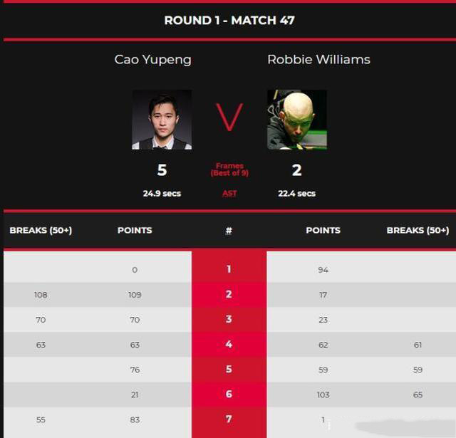直播车讯北京时间10月24日消息,2021斯诺克德国大师赛资格赛第一轮继续进行,一场焦点比赛中,中国名将曹宇鹏发挥出色,轰出一杆破百(108分)和三杆50+(70分、63分、55分),5-2战胜罗比-威廉姆斯,强势晋级资格赛第二轮。在曹宇鹏和罗比·威廉姆斯的比赛中,曹宇鹏同样表现出色。