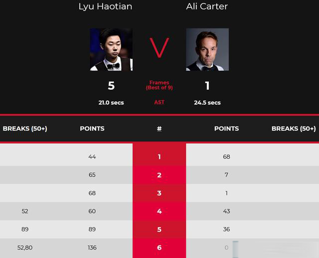 直播车讯10月24日斯诺克德国大师赛资格赛第二轮(晋级轮),中国小将吕昊天对阵阿里-卡特,吕昊天上演了逆转好戏,先输一局后连赢五局,5-1淘汰了卡特,昂首闯入到了正赛,爆出了冷门,吕昊天还在单局打出了两杆50+,相当神勇。在吕昊天和卡特的比赛,吕昊天的发挥明显要更好一些。