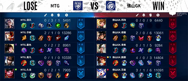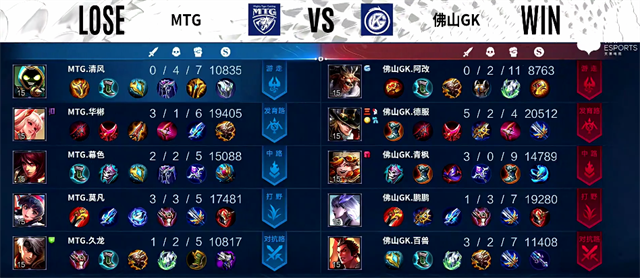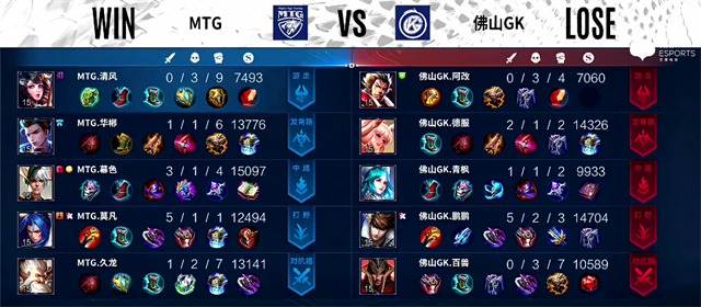 双方和平开局。2分21秒盘古拿下主宰,澜拿下暴君。3分钟中路团战,澜拿下一血。6分30秒嫦娥拿下暴君,澜拿下主宰。7分钟野区团战,MTG打出1换2。7分20秒上路团战,澜被击杀。7分56秒佛山GK上路一塔被破。8分钟MTG上路一塔被破。10分40秒澜拿下暴君,盘古拿下主宰,团战吕布被击杀,MTG推掉中路一塔。13分40秒中路团战,佛山GK打出1换3。15分钟中路团战,佛山GK打出0换4。15分28秒佛山GK推掉水晶率先拿下赛点。