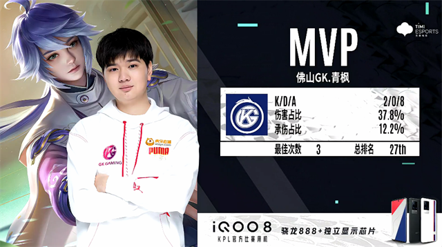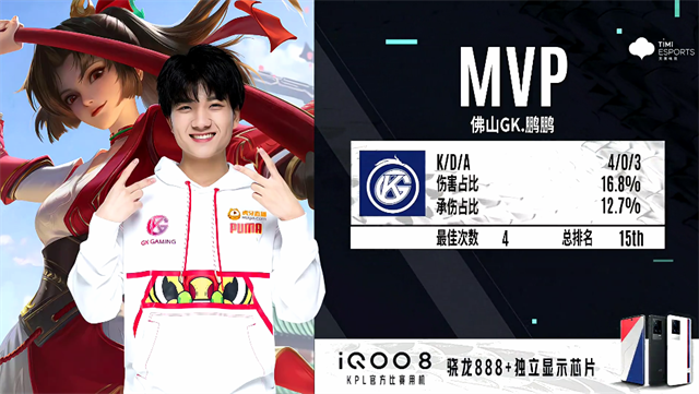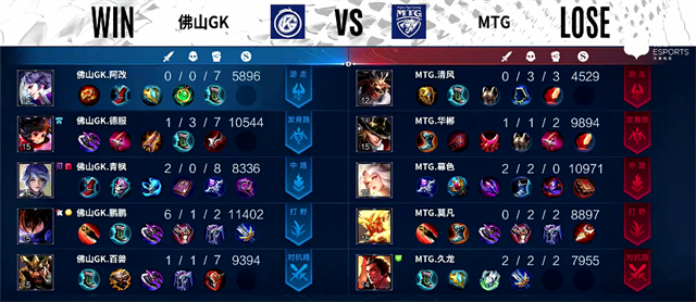 双方和平开局。2分21秒云缨拿下暴君。5分钟中路团战,蒙犽拿下一血。5分20秒双方互换边路一塔。5分50秒中路团战,佛山GK打出0换2,蒙犽推掉中路一塔。6分钟云缨拿下暴君。7分钟云缨拿下主宰。9分26秒佛山GK下路二塔被破。10分25秒赵云拿下暴君。10分41秒云缨拿下主宰。14分25秒蒙犽推掉中路二塔。14分43秒云缨拿下暴君。15分28秒嬴政拿下主宰。17分钟野区团战,佛山GK打出1换3。17分47秒佛山GK推掉水晶拿下本场比赛胜利。