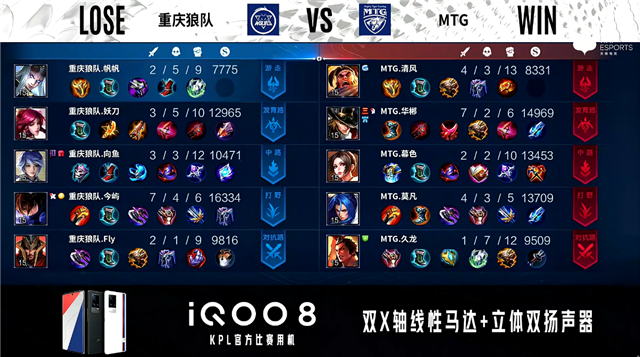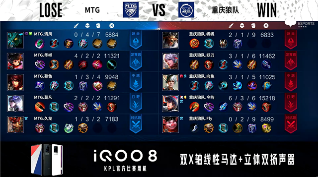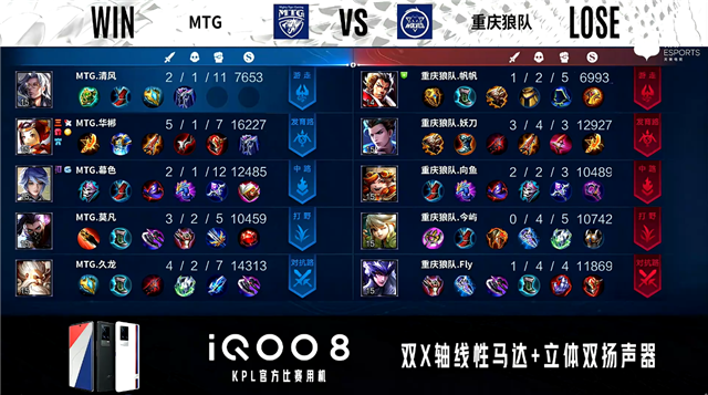 双方常规开局。2陈16秒MTG拿下暴君并击杀猪八戒。3分18秒MTG发育路击杀嬴政。4分12秒暴君处团战双方2换2。4分27秒重庆狼队野区击杀廉颇。5分整MTG主宰处击杀猪八戒。9分58秒野区团战重庆狼队打出1换2。10分06秒重庆狼队摧毁敌方中路外塔。11分39秒重庆狼队拿下暗影暴君,团战重庆狼队打出1换3。12分17秒重庆狼队高地击杀周瑜。13分18秒重庆狼队拿下暗影主宰。14分59秒野区团战MTG击杀娜可露露。15分17秒MTG摧毁敌方对抗路二塔。17分09秒重庆狼队拿下暗影暴君,团战重庆狼队打出0换5。17分47秒重庆狼队摧毁敌方水晶拿下比赛。