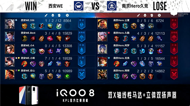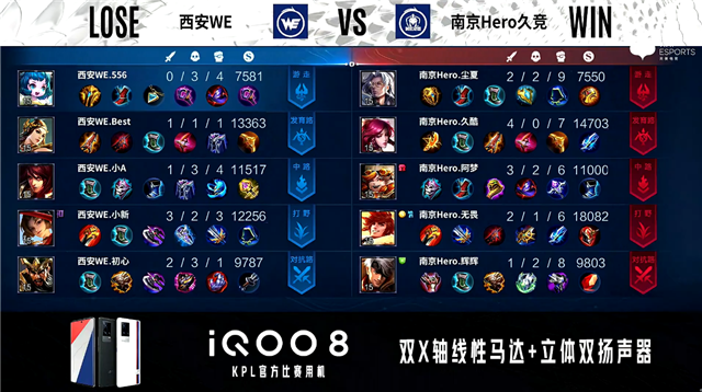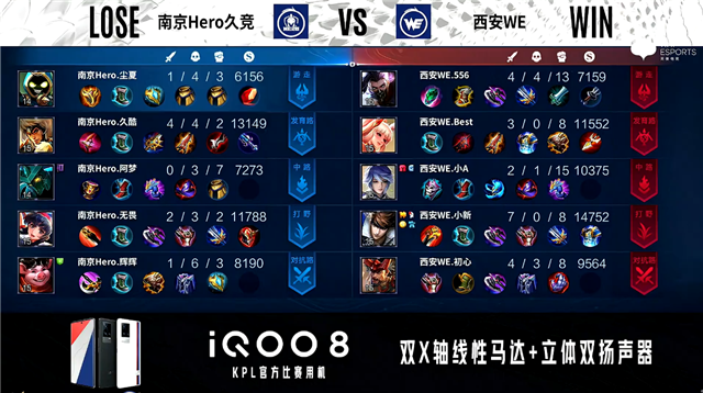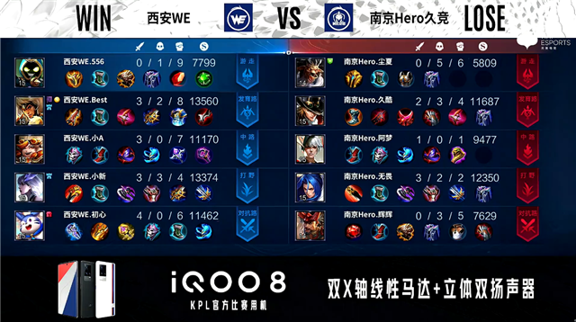 双方常规开局。2分06秒西安WE野区击杀沈梦溪拿到一血。2分28秒西安WE拿下暴君。2分45秒中路团战西安WE打出0换3。4分33秒西安WE拿下主宰。5分53秒南京Hero对抗路击杀关羽。6分42秒西安WE拿下暴君。8分24秒西安WE中路击杀沈梦溪。8分49秒南京Hero野区击杀关羽。8分59秒西安WE拿下暗影主宰。10费劲23秒中路下河道团战双方1换1。10分46秒西安WE拿下暗影暴君,南京Hero拿下暗影主宰。14分33秒主宰处团战南京Hero击杀蔡文姬。14分54秒南京Hero中路打出0换2。15分50秒南京Hero拿下暗影主宰。16分11秒南京Hero摧毁敌方对抗路二塔。18分49秒南京Hero摧毁敌方中路外塔。19分19秒南京Hero拿下暗影暴君。20分07秒对抗路团战南京Hero打出0换4。20分36秒南京Hero团灭对手摧毁水晶拿下比赛。