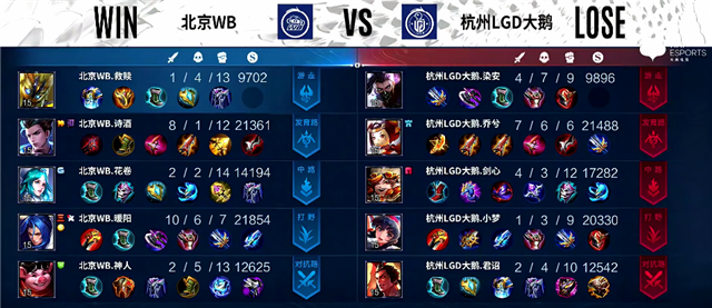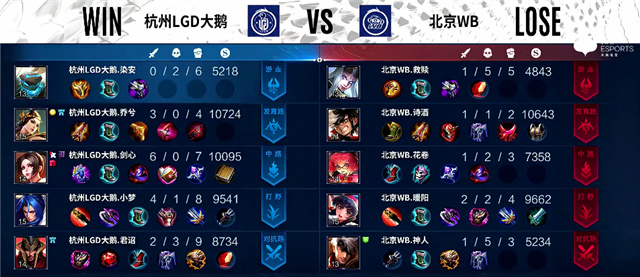 双方和平开局。2分15秒兰陵王拿下暴君,赵云拿下主宰。3分50秒下路团战,弈星拿下一血,杭州LGD大鹅打出0换2。4分10秒黄忠推掉下路一塔。6分钟黄忠推掉上路一塔。6分30秒梦奇拿下暴君,团战杭州LGD大鹅团灭北京WB。7分15秒黄忠推掉中路一塔。8分钟赵云拿下主宰。8分40秒上路团战,杭州LGD大鹅打出2换5团灭北京WB,9分11秒杭州LGD大鹅推掉水晶率先拿下赛点。
