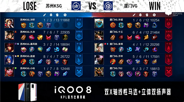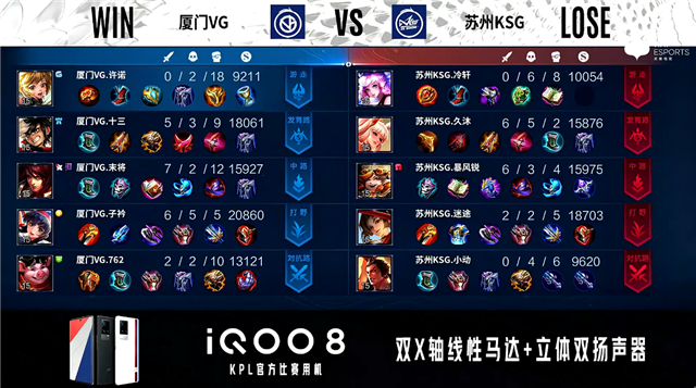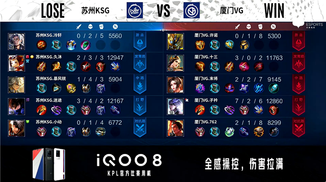 开局厦门VG暴君处击杀瑶拿到一血。1分48秒苏州KSG公孙离发育路单杀蒙犽。2分15秒苏州KSG拿下暴君,厦门VG拿下主宰。3分27秒厦门VG中路击杀沈梦溪。4分10秒发育路团战厦门VG击杀瑶。4分26秒野区团战苏州KSG打出0换2。7分25秒对抗路团战苏州KSG击杀周瑜并摧毁对抗路二塔。8分05秒苏州KSG发育路击杀娜可露露。9分09秒中路团战苏州KSG打出1换4。9分48秒厦门VG摧毁敌方对抗路高地塔。10分52秒苏州KSG拿下暗影暴君。12分08秒野区团战厦门VG打出0换3。13分58秒苏州KSG拿下暗影主宰。15分31秒苏州KSG发育路击杀娜可露露。15分46秒苏州KSG犯下暗影暴君。16分08秒中路团战厦门VG打出1换3。18分21秒苏州KSG拿下暗影主宰。21分21秒野区团战双方1换1。23分37秒中路团战厦门VG打出1换3。24分35秒厦门VG拿下风暴龙王。25分34秒厦门VG对抗路打出0换2。26分09秒厦门VG团灭对手摧毁水晶拿下比赛。