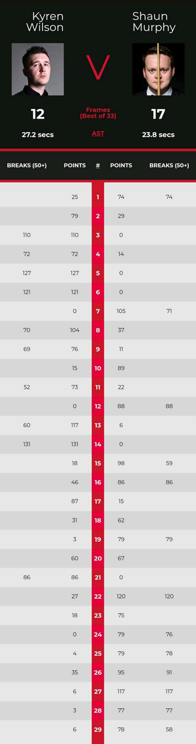 首局威尔逊先上手,得到25分后出现失误。墨菲拿到机会一杆攻下74分,后来居上先拿一局。第2局威尔逊逐渐掌控局面,几次上手后以79-29获胜追平。第3局威尔逊长台打进红球后,直接轰出一杆破百,得到110分零封2-1反超。第4局,墨菲先拿14分后打丢,威尔逊上手单杆72分拿下,3-1进入中场休息。