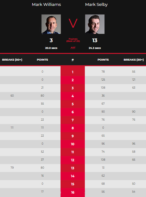第15局,威廉姆斯防守薄球被罚4分,塞尔比长台打进连续进攻,一杆50分后咖啡球失误。威廉姆斯进攻又失手,塞尔比又上手,以68-0获胜12-3拿到赛点。第16局塞尔比尝试中袋红球未进,威廉姆斯得到17分再送机会。塞尔比一杆得到54分,此后再下两颗红球,以56-17锁定胜局。