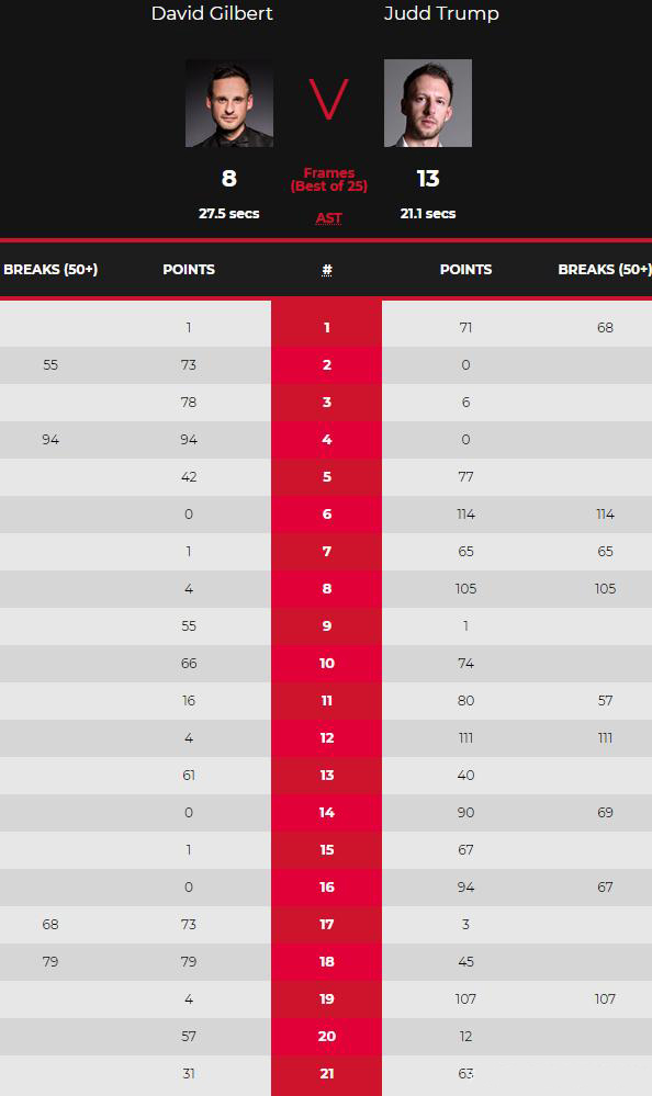 第21局,特鲁姆普单杆14分防守,粉球黑球贴库,特鲁姆普连续低分值彩球单杆36分,黄球不进;吉尔伯特单杆3分防守,吉尔伯特单杆24分,黄球不进;特鲁姆普没有解到黄球,特鲁姆普反做;吉尔伯特没有解到黄球,特鲁姆普打进黄球56-31延分;特鲁姆打进绿球咖啡球拿下比赛。