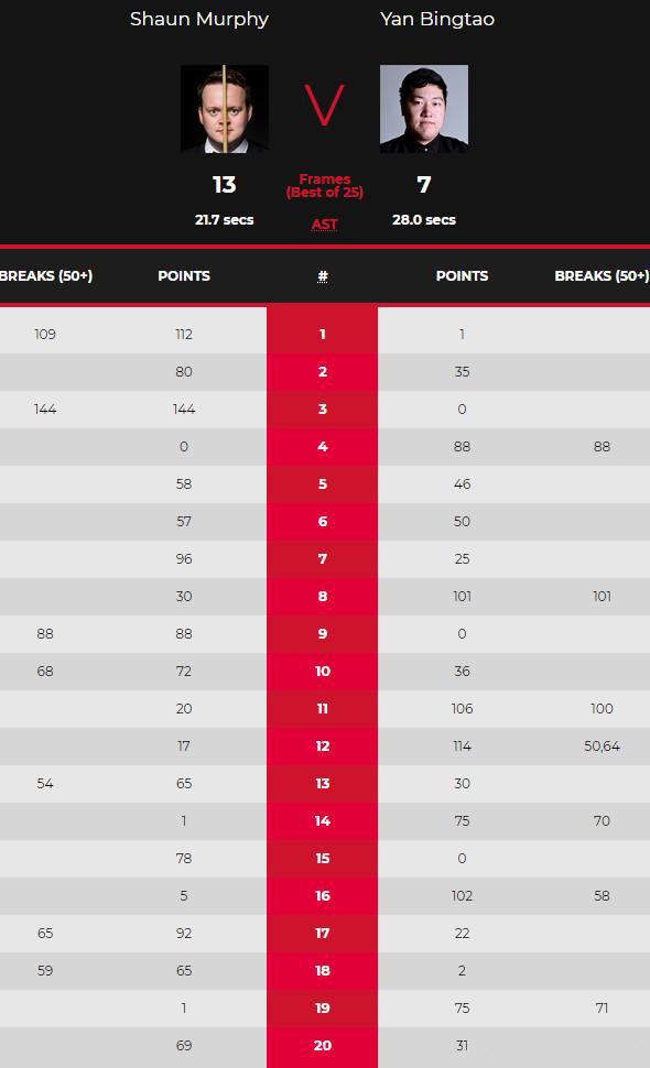 第1局,墨菲单杆轰出109分,总比分1-0领先,第2局,两人均比较谨慎,比分一度胶着,墨菲抓住颜丙涛防守漏球的失误,打到59-35时防守,最终80-35拿下本局,大比分2-0领先!第3局,两人防守几个回合之后,墨菲抓住机会一杆长台上手,一杆清台打出144的高分,成为本届赛事单杆最高,总分3-0领先!第4局,颜丙涛单杆88分追回一局,总分1-3!