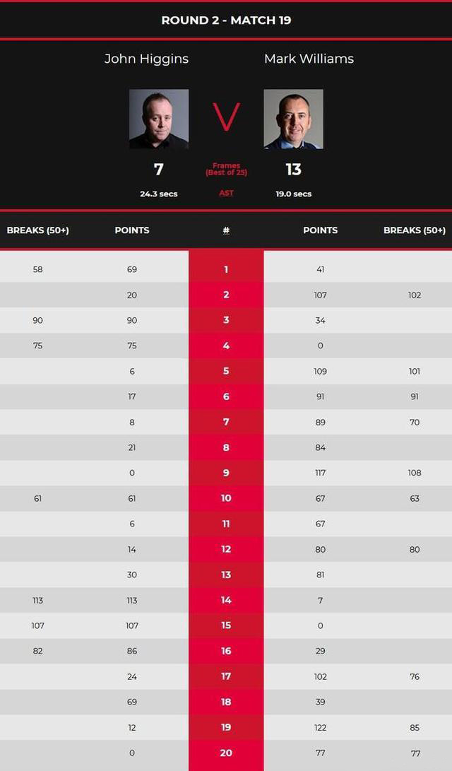 第19局,威廉姆斯凭借单杆85分,在多次上手后,以122-12再胜一局,大比分12-7拿到赛点。第20局,威廉姆斯没再给希金斯任何机会,在上手后,直击轰出单杆77分,以77-0零封获胜,大比分13-7晋级8强。
