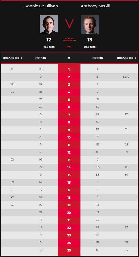 第11局,麦克吉尔长台打进后充分上手,一杆破百得到126分,清台获胜7-4领先。第12局奥沙利文远台攻入红球,得到7分蓝球中袋失误。麦克吉尔延续好的手感,单杆89分零封再胜,8-4来到中场休息。短暂休整后的第13局,奥沙利文开局又留机会,麦克吉尔右侧中袋红球打进,随即进攻黑球失误。此后麦克吉尔再进红球,同样未能连接彩球,奥沙利文拼进长台,终于找到一些手感,打出一杆92分以92-2追上一局。