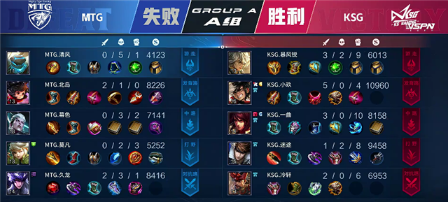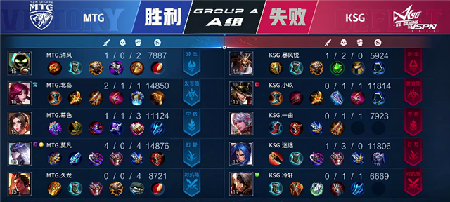 开局KSG入侵野区,狂铁拿下一血。1分钟镜入侵野区拿下红Buff。1分30秒娜可露露在野区被击杀。2分40秒下河道团战,KSG打出0换2。3分14秒虞姬拿下暴君。3分35秒牛魔被击杀。4分15秒镜在上路击杀娜可露露,虞姬推掉下路一塔。5分30秒下河道团战,虞姬拿下双,团战KSG打出0换2。6分49秒虞姬推掉中路一塔。7分10秒野区团战,马可波罗被击杀。7分40秒KSG强攻上路高地塔,双方1换1。8分15秒KSG拿下暴君。8分35秒野区团战,KSG打出1换2,虞姬拿下双杀。9分10秒娜可露露推掉上路一塔。9分55秒野区团战,牛魔被击杀。10分36秒镜单杀娜可露露。10分55秒KSG推掉上路一塔直逼水晶。11分钟KSG团灭MTG,推掉水晶追回一分。