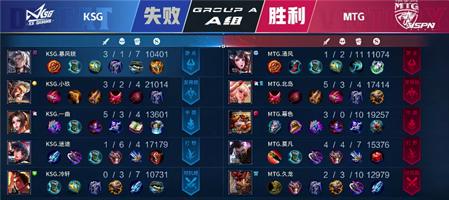 开局双方中路抢线,太乙真人拿下一血。2分20秒MTG拿下暴君,KSG拿下主宰。4分15秒KSG推掉上路一塔。5分10秒MTG推掉下路一塔。6分钟上河道团战,猪八戒被击杀。6分50秒杨玉环拿下暴君。7分15秒中路团战,猪八戒被击杀。8分45秒狄仁杰推掉下路二塔。9分30秒双方互换边路一塔。9分40秒MTG推掉上路二塔。11分27秒猪八戒拿下暴君。13分10秒MTG拿下暴君。14分45秒MTG推掉中路一塔。15分40秒MTG拿下暴君。16分35秒野区团战,MTG打出1换2。16分50秒MTG强攻中路二塔,团战打出0换2,MTG顺势进攻高地,关羽击杀甄姬。17分13秒MTG攻破水晶拿下本场比赛胜利。