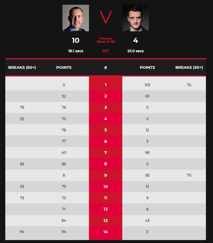 第二阶段开始,马克威廉姆斯率先发力,单杆53分,79-13,先赢下第十局。单杆73分,73-9,马克威廉姆斯再赢下第十一局。随后的两局球,克雷吉都做了顽强抵抗,马克威廉姆斯71-8、84-43赢得并不轻松。第14局,世锦赛3冠王赢得干脆利落,抓住机会轰出单杆94分零封对手,10-4淘汰克雷吉晋级16强。