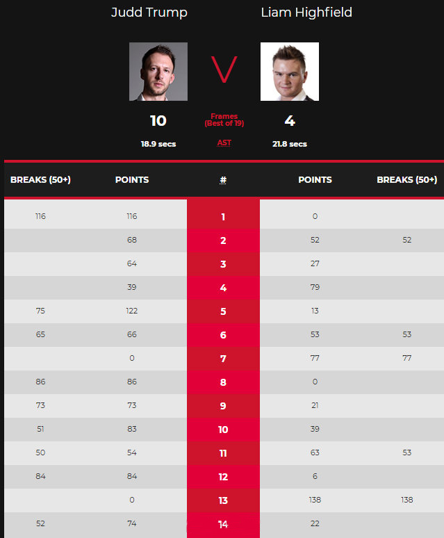 第5局,局间休息回来之后,特鲁姆普打出单杆75分,122-13赢下,比分优势扩大到4-1。第6局,特鲁姆普打出单杆65分,66-53再胜一局,比分来到5-1。第7局,海菲尔德单杆77分制胜,6-1领先。第8局,特鲁姆普单杆86分零封海菲尔德,6-2领先。第9局,特鲁姆普又打出单杆71分,71-21再胜一局,比分优势扩大到7-2,第一阶段结束。
