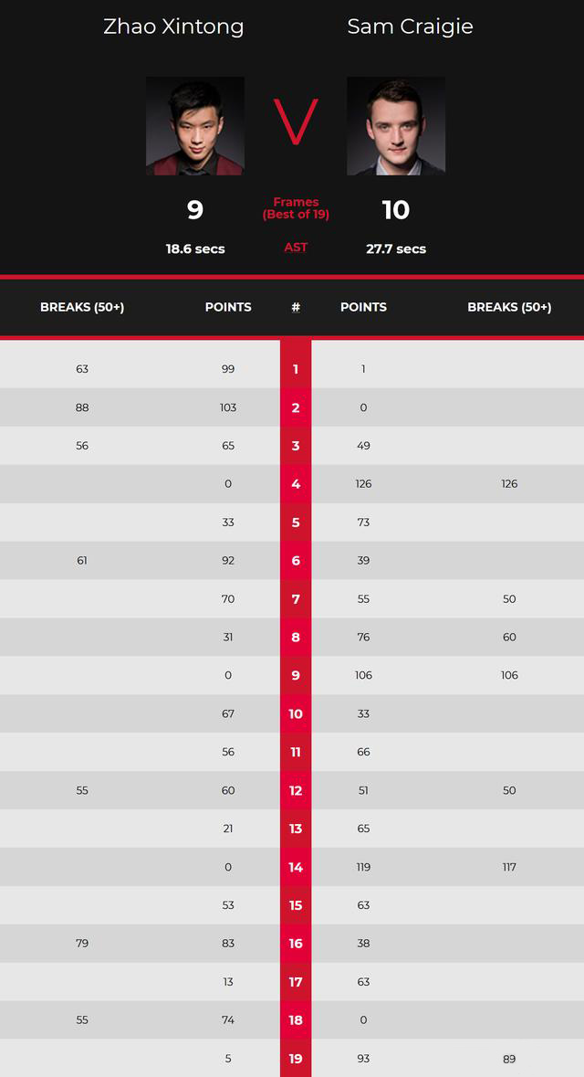 第16局,赵心童单杆79分拿下。第17局,克雷吉超分,赵心童继续上手,黑球不进,认输。第18局,赵心童单杆55分,以74-0拿下。9-9进入决胜局。