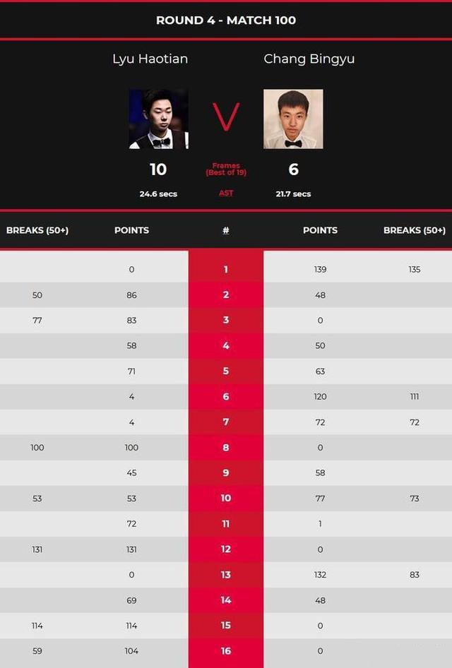 第二阶段双方你来我往,第10局吕昊天一杆53分被常冰玉单杆73分逆转,此后连赢两局在第12局打出一杆131分,取得8-4的领先。第13局常冰玉一杆83分追上一局,比分来到5-8,第14局,双方争夺十分激烈,最终,吕昊天以69-48胜出。第15局吕昊天打出本场个人第三杆破百,攻下114分零封9-6获得赛点。第16局吕昊天一鼓作气,一杆59分锁定胜局,总比分10-6打进正赛。