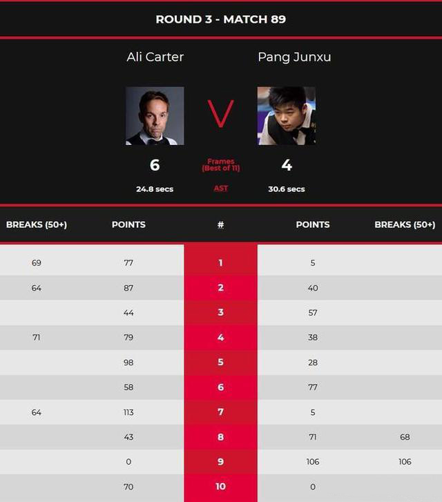 休息回来,第5局,卡特多次上手后,以98-28再胜一局,大比分4-1领先。第6局,庞俊旭再次抓住机会,凭借多次上手,以77-58又追一局。第7局,卡特轰出单杆64分,以113-5再胜一局,大比分5-2拿到赛点。关键时刻,背水一战的庞俊旭终于打出了他今天仅有的2杆单杆50+——第8局,他打出单杆68分,以71-43追回一局;第9局,他更是直接轰出单杆106分的全场唯一一杆单杆破百,以106-0再救一个赛点。不过,第10局,卡特再没给他机会,多次上手后,以70-0获胜,大比分6-4晋级第四轮。