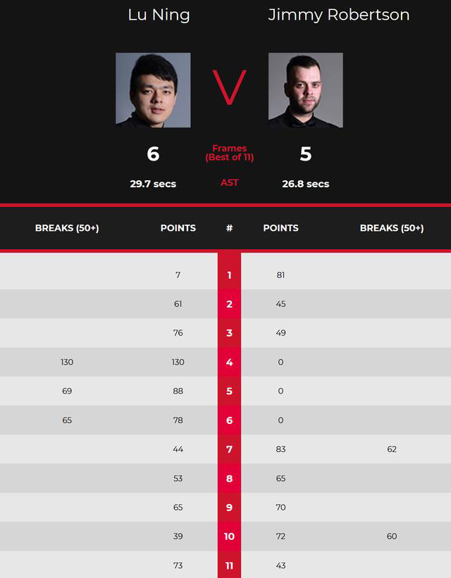 第5局,罗伯逊又被压制,鲁宁单杆69分、88-0零封,4-1,手握相当明显的优势。第6局,鲁宁打到了10分后中断,罗伯逊依旧没机会,鲁宁单杆65分,78-0再次零封,5-1,赛点出现。第7局,鲁宁单杆44分中断,罗伯逊单杆62分、83-44追回一局。第8局,罗伯逊52分领先,鲁宁零敲碎打追到48-52,打进蓝色球后反超,罗伯逊58-53,台面只剩一颗黑球,罗伯逊拼进拿下。