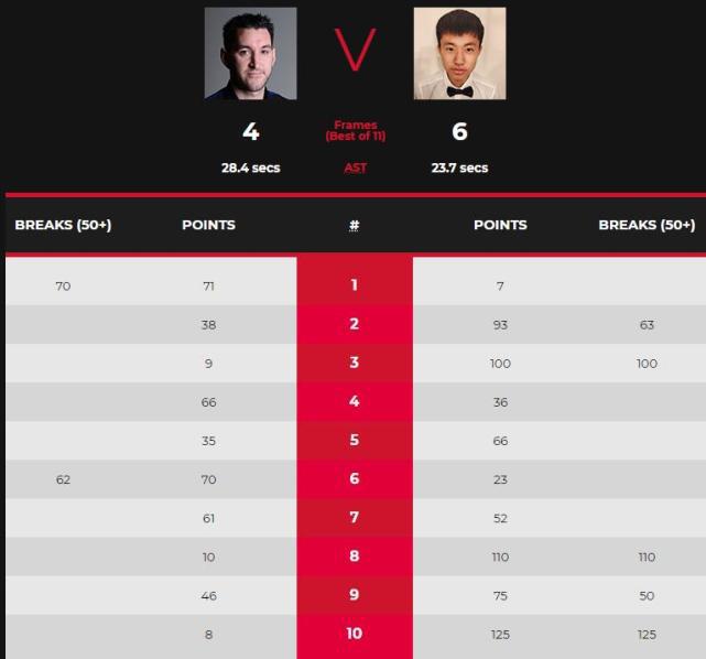 第6局,福德打出本场比赛个人的第二杆50+(62分),70-23赢下,3-3追平比分。第7局,常冰玉与福德展开拉锯战,在胶着的比赛中,福德以61-52九分险胜,4-3再次领先。