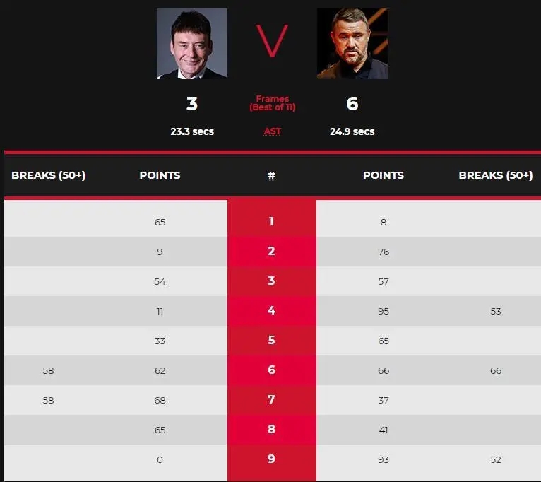 第7局,怀特背水一战,打出一杆58分以68-37取胜追上一个赛点。第8局,双方错进错出,随着比赛的深入状态下滑,怀特手感稍胜一筹,尽管亨德利落后时希望通过斯诺克挽回败局,但怀特打进粉球后以65-41再追一局。第9局,亨德利先得27分后炸红球堆效果欠佳,此后再拿14分转入防守。怀特又送机会,亨德利上手一杆得到52分,以93-0零封锁定胜局。