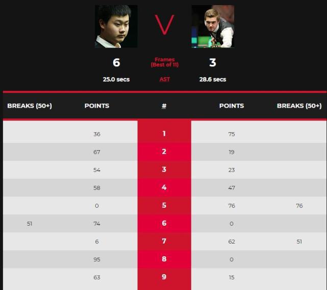 第6局,赵剑波选手回敬单杆51分,74-0零封缪尔,4-2再次扩大领先优势。第7局,缪尔单杆51分制胜,62-6胜出,比分来到4-3。第8局,赵剑波通过几次上手,95-0零封缪尔,比分来到5-3并赢得本场比赛的赛点。
