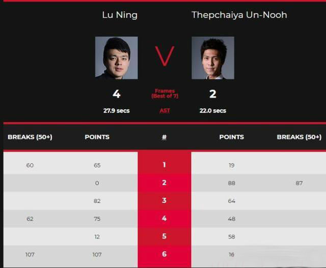 第六局,没有任何退路的“泰国一哥”继续展开反击,他在开局率先上手,得到16分后断掉,鲁宁上手轰出单杆107分,107-16锁定胜局,总比分4-2获胜晋级。