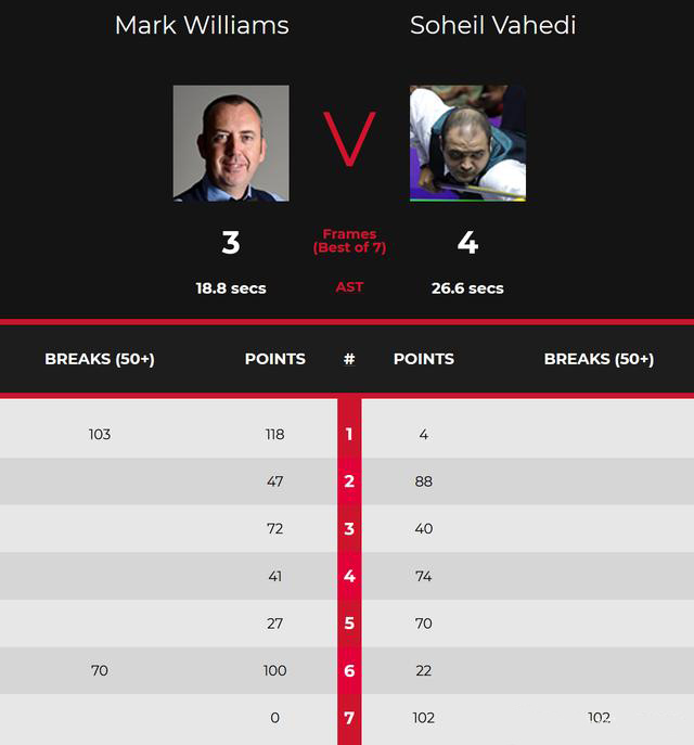 第一局上来,威廉姆斯迅速进入状态,打出了单杆103分、118-4大胜开门红。第二局,两人连续得分都不好,瓦海迪88-47拿下,1-1扳平。第三局,威廉姆斯还以颜色,72-40拿下,大分2-1再次领先。第四局,瓦海迪74-41再次回敬,2-2战平。第五局,瓦海迪又是多杆上手,抓住威廉姆斯留下的机会,70-27赢下,3-2反超拿到了赛点。
