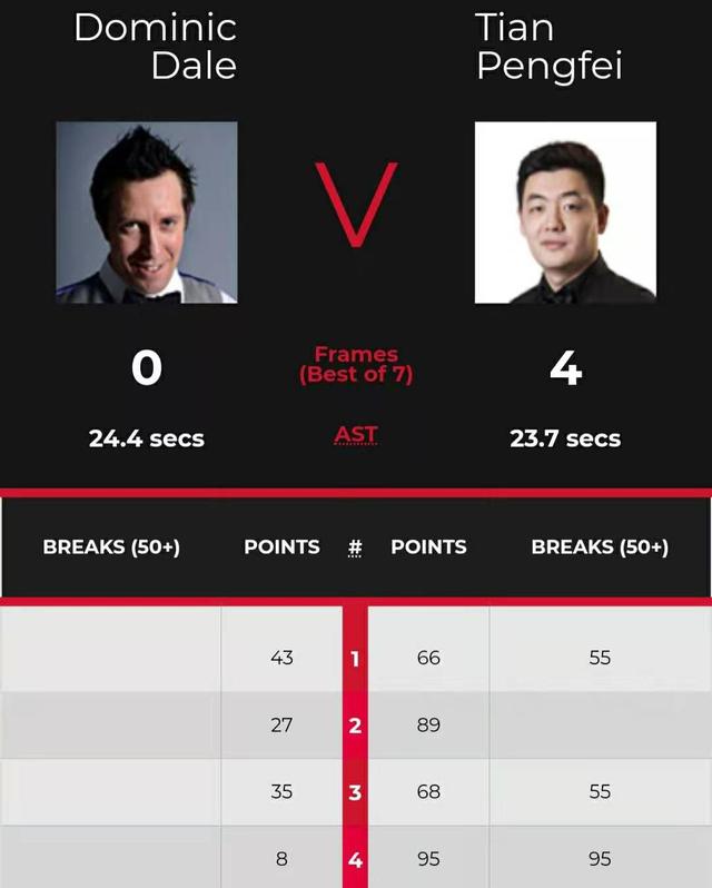 第三局,田鹏飞拿到56分后,进攻不中!戴尔连续拿到31分,进攻不中!田鹏飞架杆,瞄着左侧底袋,可惜红球不进!戴尔也防守,此后,田鹏飞拼进红球,然后防守。61-31后,双方都有机会。此后田鹏飞强势拿下,局分3-0领先了。第四局,没有悬念,田鹏飞顺利横扫晋级,局分4-0!