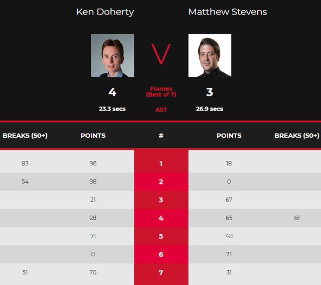 直播车讯 北京时间3月2日晚,2021斯诺克直布罗陀公开赛首轮比赛继续进行。51岁的前世界冠军达赫迪迎战马修·史蒂文斯,两人大战7局,达赫迪打出单杆83分、54分、51分,尤其决胜局那杆51分相当精彩,最终以4比3惊险晋级。