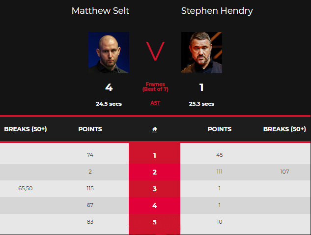 首局亨德利上手后,打出一杆38分错失中袋红球。塞尔特的进攻手感更佳,几次上手以74-45先声夺人。第二局塞尔特先后打进两颗红球,亨德利充分进入比赛状态,一杆制胜成功破百,攻下107分以111-2扳平比分,这也是台球皇帝职业生涯的第776杆破百。