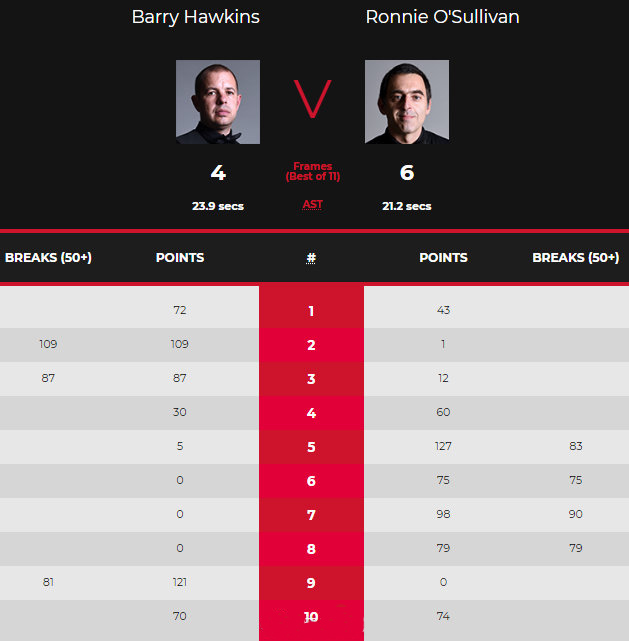第五局,奥沙利文打出本场比赛第一杆50+(83分),127-5再扳一局,比分迫近至3-2。第六局,奥沙利文持续发力,霍金斯完全被奥沙利文的进攻火力所压制。这一局,奥沙利文又打出单杆75分,75-0零封霍金斯,3-3追平比分,发回到同一起跑线。