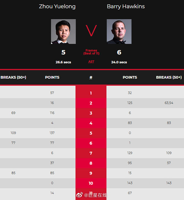 第五局,周跃龙单杆破百109分!3-2再度取得了领先。第六局,周跃龙77-1再胜一局,总局分4-2领先。第七局霍金斯打出一杆破百,攻下109分以129-6胜出。第八局霍金斯单杆拿下57分后,以95-37再下一城追至4-4。第九局霍金斯先拿15分,周跃龙利用对手失误的机会,一杆得到85分,5-4先拿赛点。
