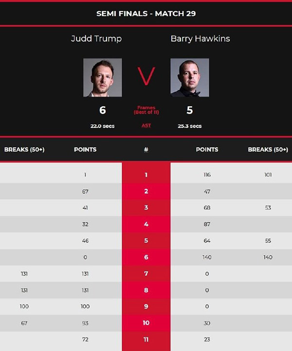 在特鲁姆普和霍金斯的上半场比赛之中,特鲁姆普的表现可谓非常低迷。首局比赛中,霍金斯凭借单杆101分的强势表现以116:1拿下此局比赛的胜利取得1-0的领先。第二局,特鲁姆普凭借多次上手机会拿到67分从而以67:47上演单局逆转将比分改写为1-1平。第三局,霍金斯凭借单杆53分的强势表现以68:41拿下此局比赛的胜利从而以2-1领先特鲁姆普再次获得一局的领先优势。第四局,霍金斯凭借多次上手的机会以87:32拿下此局比赛的胜利以3-1领先特鲁姆普。