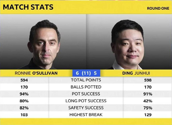 第十局,奥沙利文开球便漏出机会,丁俊晖两次上手都没能连续进攻,最终奥沙利文上手以110-17扳平比分,将比赛拖入决胜局,5-5回到同一起跑线。决胜局,奥沙利文拼进远台红球,并叫到点位黑球,丁俊晖恐将凶多吉少。奥沙利文仅得到34分,进攻右边中袋红球不进,丁俊晖薄进红球,白球落点不理想,强行进攻极有难度的咖啡球不进,奥沙利文再次获得上手机会,此时红球的分布极好,丁俊晖很难再回到台面,最终奥沙利文以107-1绝杀丁俊晖,6-5逆转晋级。